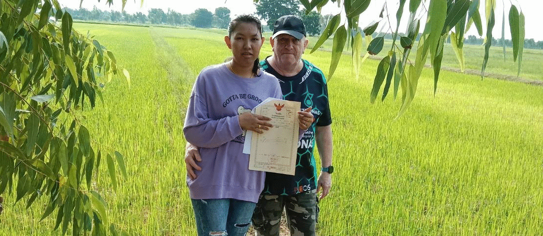 There we stood – Boom with her sunhat slightly askew, and me (Eric) holding a measuring tape and a camera, right in the middle of two rai of land, surrounded by endless rice fields. The rice was nearly ready for harvest, swaying like a golden sea in the breeze.
